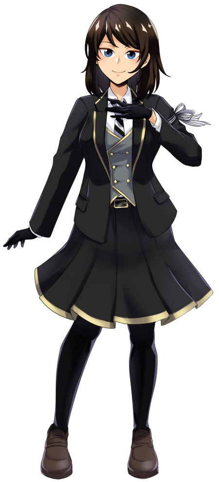 The uniform after Yuu stopped cross-dressing consists of a white shirt, gray vest, unbuttoned blazer, necktie, pleated skirt with length right above her knees, thigh-high socks, stripped ribbon on right arms, black gloves, and loafer shoes. Her summer uniform consists of a short-sleeved white shirt, gray vest, necktie, pleated skirt with thigh-length, ankle-length socks, stripped ribbon on right arms, and loafer shoes.